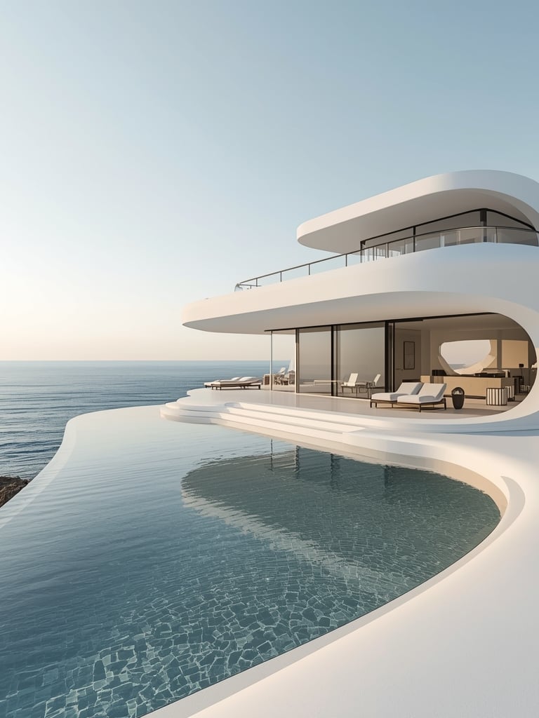 Situated on the dramatic Spanish coastline, Villa Mediterranean embodies the ultimate synthesis of contemporary architecture and natural beauty. The design philosophy focuses on fluidity and lightness, featuring sweeping organic curves that mirror the rhythmic movement of Mediterranean waves.